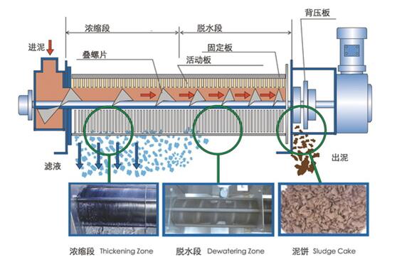 2、脫水:經(jīng)過(guò)濃縮的污泥隨著螺旋軸的轉(zhuǎn)動(dòng)不斷往前移動(dòng);沿泥餅出口方向,螺旋軸的螺距逐漸變小,環(huán)與環(huán)之間的間隙也逐漸變小,螺旋腔的體積不斷收縮;在出口處背壓板的作用下,內(nèi)壓逐漸增強(qiáng),在螺旋推動(dòng)軸依次連續(xù)運(yùn)轉(zhuǎn)推動(dòng)下,污泥中的水分受擠壓排出,濾餅含固量不斷升高,*終實(shí)現(xiàn)污泥的連續(xù)脫水。